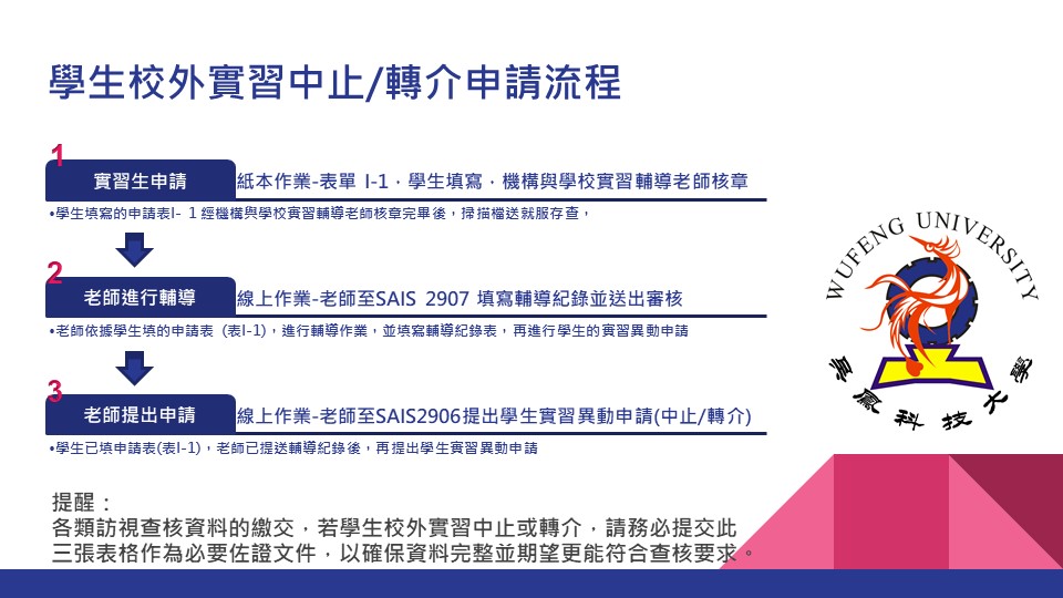 實習輔導教師應定期前往實習機構訪視實習學生或以電話、通訊軟體保持聯繫,以瞭解實習學生實務工作內容及工作規範等狀況,給予學生工作指導,解決學生工作或學習之困難,並於每次訪視輔導結束後,至sais2907填報「吳鳳科技大學學生校外實習輔導表」。(系統操作說明)