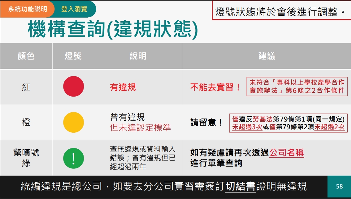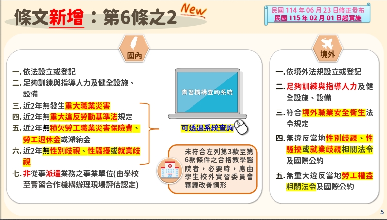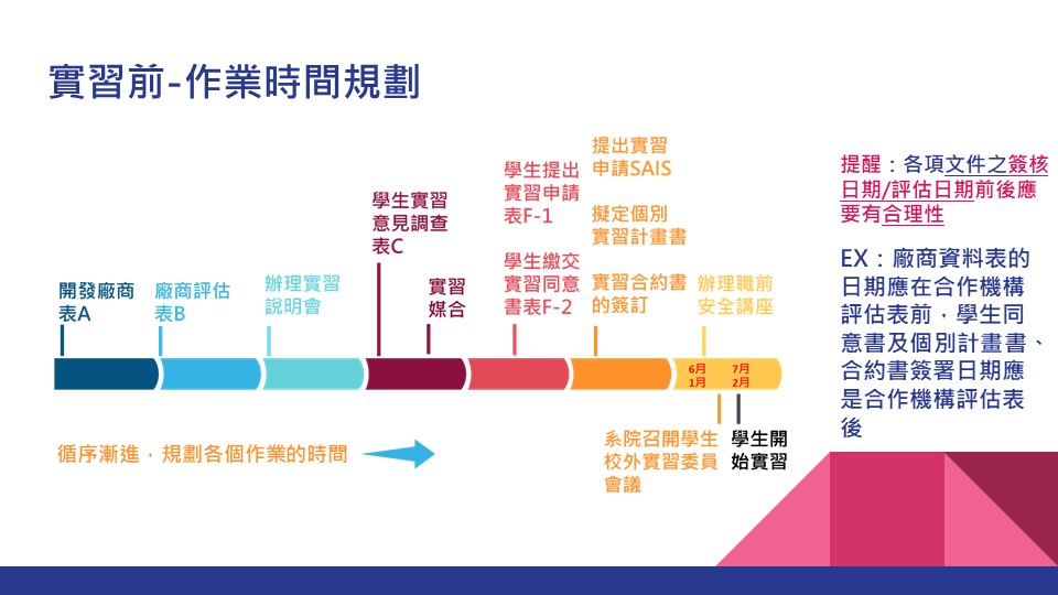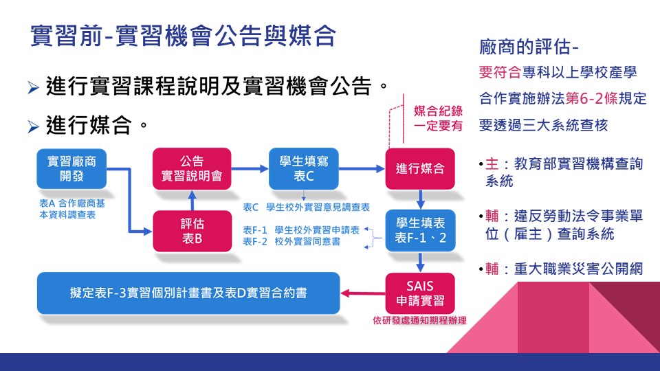 連結標籤【實習前作業時間規劃】【廠商評估】【課程說明及實習機會公告作業】【實習申請】【勞動權益暨職業安全職前訓練】【重要事項提醒】 公告:114學年度學生校外實習(含新南向專班)作業通知及進程規劃(114.01.04.學生校外實習委員會議通過)114.03.28校外實習程說明會(行政)簡報實習前、中、後作業規劃參考實習申請系統操作說明(簡易版)🔺113年技專校院勞動知能研習資料參考(實習場域評估及檢核、職安與職災預防、校外實習機制與學生權益常見議題說明) TOP 【實習廠商評估】 系/院級學生校外實習委員會-確認合作機構評估結果與選定 【實習機構應具備的條件說明簡報】實習機構評估注意事項(113.05.03.教育部函示-應落實實習機構評估)實習合作廠商需符合「專科以上學校產學合作實習辦法」第6-2條規定。實習機構評估查詢系統主-教育部實習機構查詢系統 【系統操作手冊】【系統實務指南-操作簡報說明】-各系配有一組系統帳號密碼,教師使用需求請洽系辦。-若對於查詢系統有疑慮,可再使用下列2大系統,輔助查詢評估機構是否符合規定。輔-違反勞動法令事業單位(雇主)查詢系統輔-重大職業災害公開網 TOP 【課程說明及實習機會公告作業】 依規定,各系應辦理實習說明會,向欲參加校外實習學生(含新南向專班)公布詳細之實習機會,包含企業名稱、地點、(薪資)津貼、實習內容(含課程規劃)、交通與膳宿狀況等,供學生選擇實習機會參考,並協助學生進行實習媒合。 TOP 【實習申請】 研發處受理各系申請學生校外實習作業期程為每學期第 9 週起至 第18週止,申請作業由各系實習輔導教師或專人(非學生或工讀生)至「SAIS行政系統-29 研發處管理-2905(簡易操行說明載點)」提出(事關學生實習保險投保作業,逾期將不予受理)。 校外實習申請案敬請依本校「學生校外實習課程實施要點-實習課程型態」「學期」、「學年」、「海外」及「其他」分別申請。 學期實習:9 學分/720 小時,2 月或 9 月開始,至少 18 週或 4.5 個月。 學年實習:18 學分/1440 小時,2 月或 9 月開始,至少 9 個月。 暑期實習:2 學分以上/320 小時,7~8 月進行,至少 8 週。 其他實習:同一學期開設至少 2 學分以上之校外實習課程,且應於同一機構進行實習,每日連續實習達八小時;其累積總時數(不包括校外參訪及實務見習等),以不得低於320 小時為原則或依相關計畫規定辦理。 新南向專班與雙軌班、產攜班及社工師、教保員實習之實習課程型態屬之。 新南向專班之校外實習申請,因應實習廠商函報勞工主管機關及學生校外實習保險投保作業,敬請各系最晚應於開學日前 10 個工作天完成系統申請。 新南向專班校外實習廠商,須為教育部核准,如未獲核准或申請新增中,請勿提出申請。 TOP 【勞動權益暨職業安全職前訓練】 依規定,學生參與校外實習前,應接受勞動權益暨職業安全職前訓練,研發處將於每學期 16 週前後(1 月/ 6 月)辦理「學生校外實習勞動權益暨職業安全職前教育講座」,向實習學生進行新制度事項之宣導及說明、意外保險投保及相關作業等事宜,敬請務必督促同學參加講座。勞動權益與職安、性別與工作線上教材專區 TOP 【重要事項提醒】 各系應建立良好師生聯繫管道,尊重學生實習意願,並請實習輔導老師忙碌之餘撥冗關懷實習學生,如遇重大傳染病影響正常學習時,應以考量學生健康安全為優先,協助學生以彈性修課方案完成校外實習課程。學生校外實習遇重大傳染病影響正常學習時,原則上應改線上實習(如:居家辦公)或其他替代教學方式,但如實務上無法用線上授課方式進行,個別學生基於學習需求擬繼續實習,仍希望續留實習場所實習,經學校與實習場所評估實習課程的必要性、實習學生的防疫安全、該實習場所環境安全等情形,並有完善規劃,得尊重學生意願繼續實地實習。依本校「學生校外實習課程實施要點」規範,為使學生能於校外適當場所,透過實務印證所學專長,各學術單位得開設校外實習課程,以培養學術及實務經驗兼備之人才;經各課程開設單位審核通過之機構,提供之實習項目應與本校學術單位之發展及教學目標相契合者,以確保學生學習權益。依本校「學生校外實習辦理流程」,「實習合約書」&「學生個別實習計畫書」應於實習開始日前 3 週前完成。實習學生應詳閱並同意校外實習合約書約定事項且完成簽署(未達法定成年年齡之實習學生,需請法定代理人再簽章)。校外實習課程實施前,應透過系上相關委員會議確認其「系科發展及專業核心能力之關聯性規劃」、「實習課程內容之規劃(含輔導教師)」、「確認合作機構之評估結果及選定」、「擬訂實習合約及學生個別實習計畫之檢核與確認」、「校外實習輔導及訪視運作機制(每 2 個月 1 次)」等相關規劃,相關會議紀錄請上傳數位學習專區備查。「廠商基本資料表」、「廠商評估表」、「實習合約書」、「學生個別實習計畫書」及「同意書」之掃瞄電子檔案上傳平台備查,敬請各學術單位於規定期限完成上傳作業。 TOP