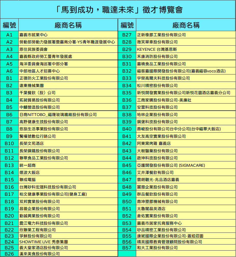 吳鳳科技大學 2026「馬到成功,職達未來」 校址:嘉義縣民雄鄉建國路二段117號活動地點:本校旭光中心3F旭光堂活動日期:115年05月07日(四)活動時間:09:30-13:30 活動海報請點我 會場地圖請點我活動流程請點我 抽獎禮品請點我會場指引請點我 停車資訊請點我徵才手冊請點我 闖關流程請點我 2026馬到成功,職達未來 廠商錄取清單 2026馬到成功,職達未來 廠商配置圖 115/04/09更新 代收履歷(請洽服務台)台南大員皇冠假日酒店嘉楠食品工業股份有限公司趣淘漫旅-台南鼎坤塑膠機械有限公司高信工程阿里山英迪格酒店聯成電腦