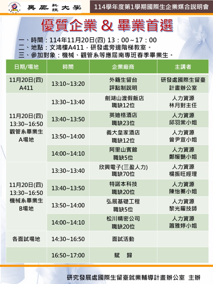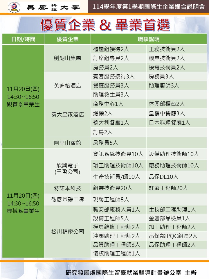 - 勞動部公告(民國113年8月26日):開放旅宿業聘僱副學士以上僑外生,從事旅宿業房務、清潔、訂房、接待及所屬餐廳外場工作。(旅宿業中階技術工作)