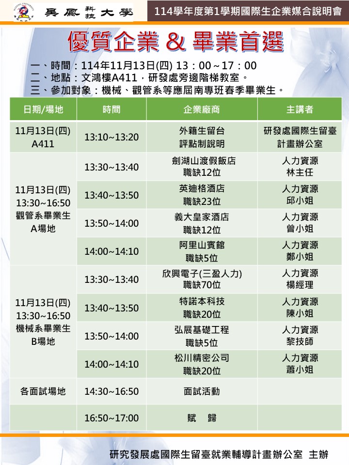 隨著國際化與新南向政策的推進,本校的國際學生數量逐年增加,為了幫助國際學生更好地融入台灣職場,並拓展他們的就業機會,本校舉辦「114學年度第一學期國際生企業媒合說明會」,希望能為國際學生提供一個平台了解職場需求、與企業直接對接等。此活動旨在增進國際學生與本地企業的互動,提升他們的就業競爭力,並加強國際學生與台灣社會的連結。