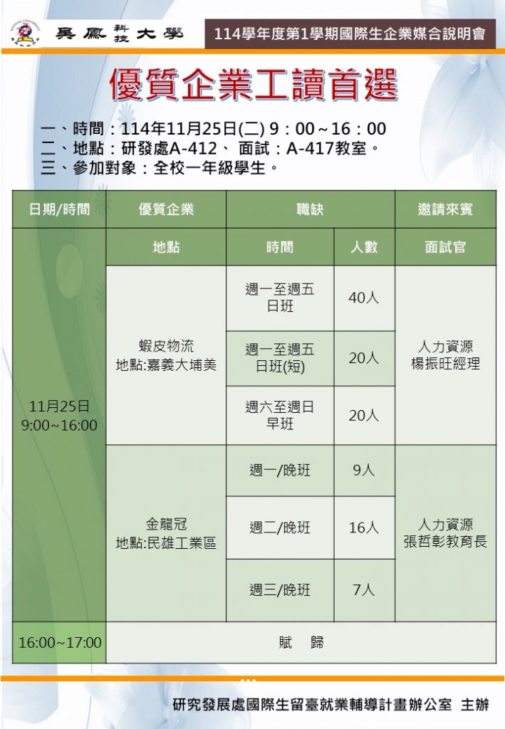 【企業媒合】114學年度第一學期「國際生企業工讀媒合說明會」