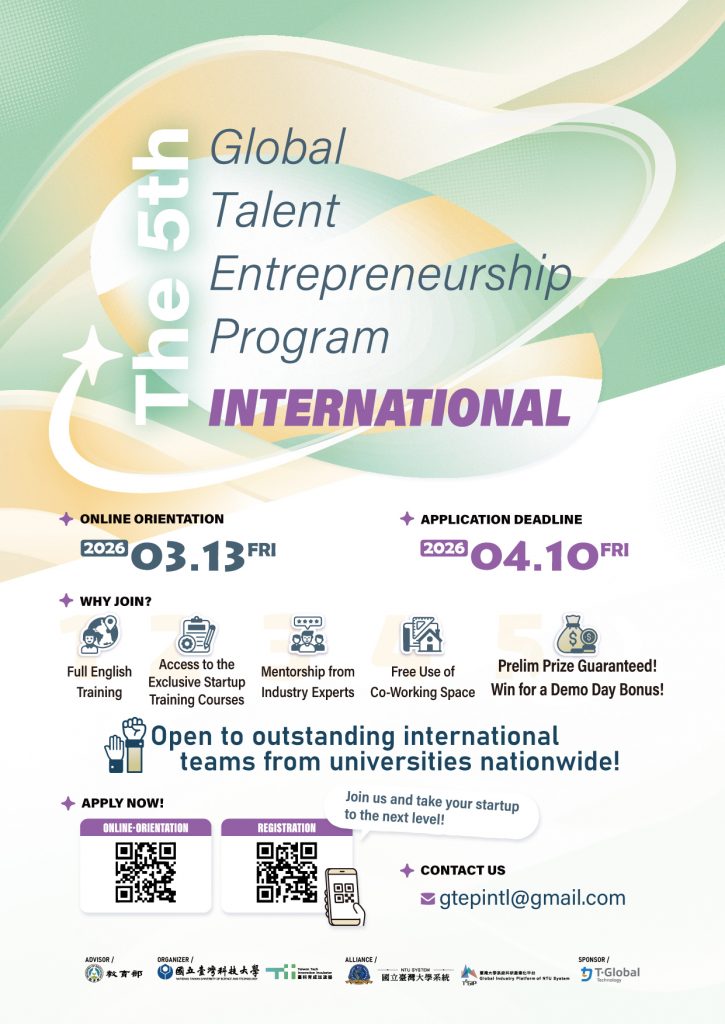 為提供在台外籍生培養創新創業知能及優質的創業培訓環境,本校今年接續推出第五屆外籍人才創新創業培訓計畫 — The 5th Global Talent Entrepreneurship Program (GTEP)GTEP),本計畫開放全國大專校院外籍生及本國學生參加,通過初選即得企業贊助之創業獎金,更有機會贏得Demo Day優勝獎金!歡迎對創業有興趣、已創業或準備創業的學生敬請把握機會。